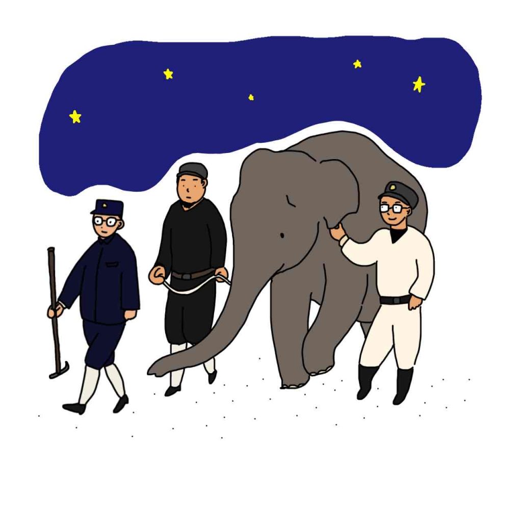 このゾウは、飛行機の建設用地として強制撤去のため、閉園を余儀なくされた阪神パークからやってきたインドゾウの「カリヤニー号」です。当時の大東亜共栄構想という考え方が広く宣伝されていたこともあり、後に「共栄(ともえ)号」と改名されます。ちなみに、同時期に同じく阪神パークから来園したアミメキリンの「ワンジロー」は、「皇国(こうこく)号」と名付けられています。