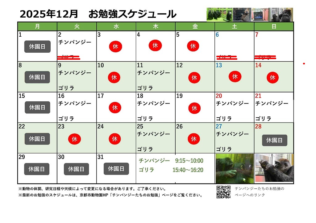 ※水曜日と金曜日は基本的にチンパンジーとゴリラのお勉強はお休みです。
