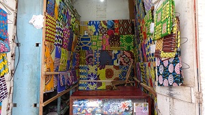 市場ではたくさんのフルーツの他にも,“カンガ”と呼ばれる