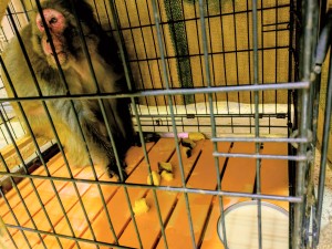 他のアカゲザルがいる隣の部屋で、顔が見える状態にして、ケージ内で管理しています。