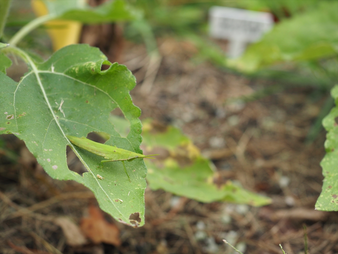 あと、葉が食べられていますが、日中はバッタを見かけるくらいで、おそらく夜行性のダンゴムシやヨトウムシが活動していると思われます。