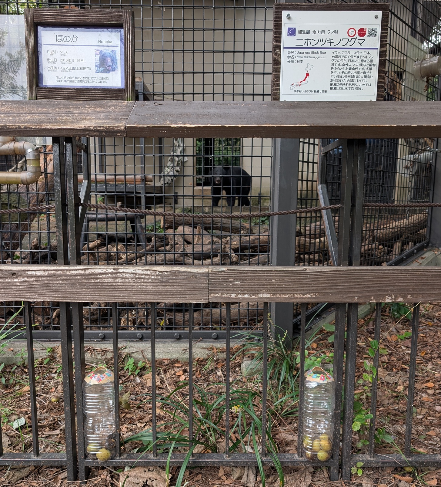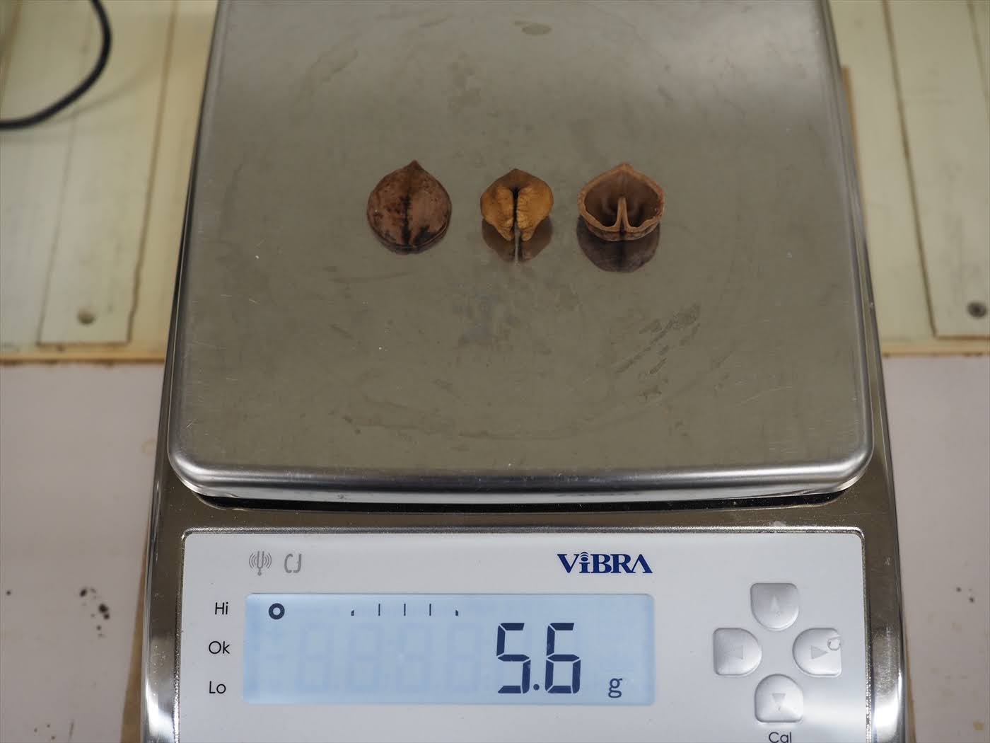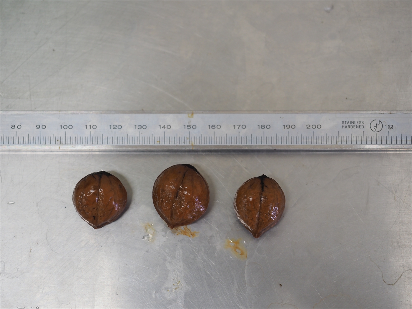 クマ舎東側にオニグルミの木があり、2022年から実を採集できるようになりました。今年は、葉がかなり虫に食われましたが、実はそれなりについています。 木の位置が園路に近く、園路にも実が落ちてくるので、今年はクマ舎にオニグルミポストを設置しました。落ちている実や核を見つけたら入れてください。 緑色で落ちているものもあれば、褐色に変化しているものもあります。 ただ、褐色に変化している実の中にはハサミムシなどがいることがあるので、虫が苦手な方はお気を付けください。 収集後、園内で洗浄処理し、ヤマアラシやリスなどにあげたいと思います。 なお、ツキノワグマのホノカは、クマ舎の上に伸びた枝からグラウンド内に落ちた実を外果ごと食べていますが、ヤマアラシやリスは核の中の仁を食べます。彼らは強靭な歯で殻を割っていますが、人の手では無理なので、万力の力を借りて中を確認したところ、約5.6gの核に、約1.8gの仁が含まれていました。 今年の実も楽しんでもらおうと思います。【参考】・2025/7/3 オニグルミの実(公式インスタグラム)・2023/11/11 オニグルミを食べるヤマアラシ(公式インスタグラム)・2023/9/29 秋の味覚「オニグルミ」初収穫(公式フェイスブック)・2022/9/26 飼育員ブログ「オニグルミ」