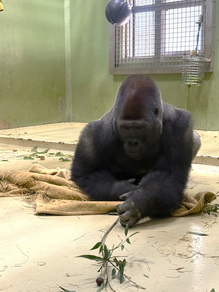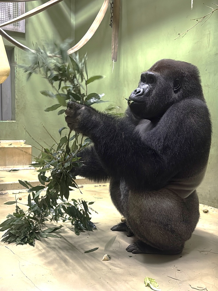 麻酔のための絶飲食のおかげで到着時にはぺったんこになっていたお腹も2日後の夕方には大きくなってきていました。ゴリラたちは繊維質の多いものをたくさん食べるため、消化中の食べ物や、それを消化するための腸内細菌の働きによって発生するガスで大きなお腹をしています。そして絶食などをすると、溜まっていた食べ物やガスが出てあっという間に驚くほどぺったんこのお腹になります。そしてそこから元の状態に完全に戻るには少し時間がかかります。ゲンタロウも元の大きなお腹に完全に戻るまでには少し時間がかかるかもしれませんが、到着後すぐからよく食べているので、心配ないと思っています。