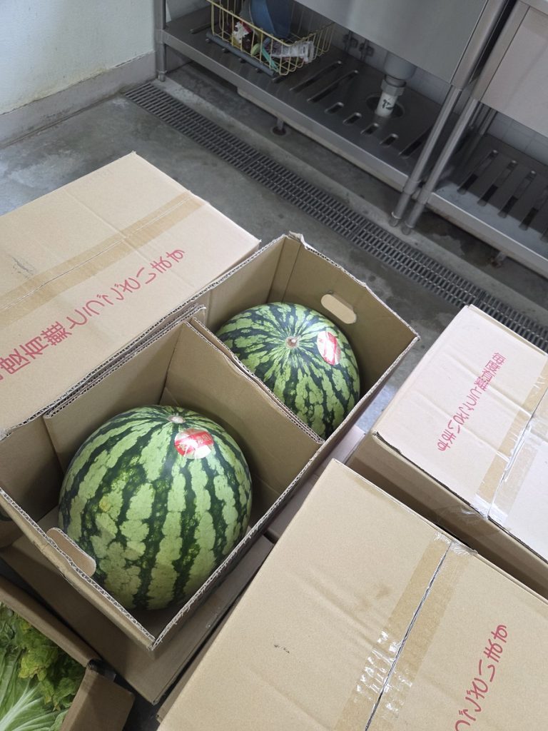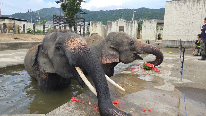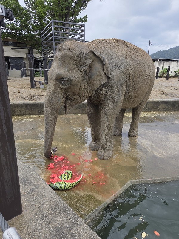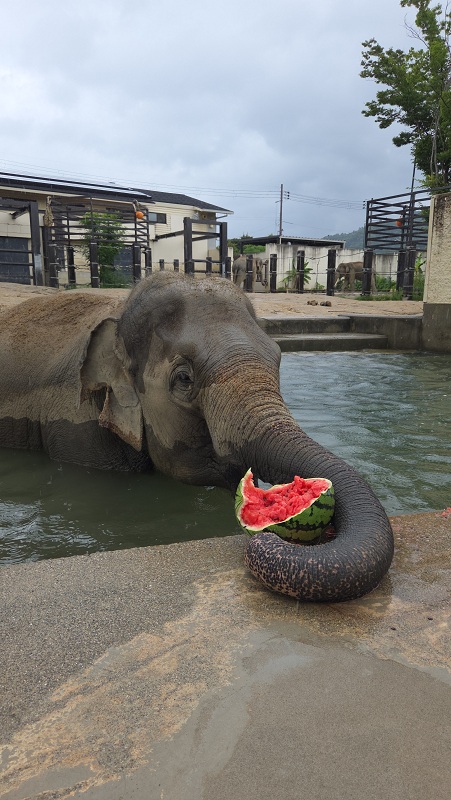 (数か月前のことですが・・・)今年の夏は8月、9月の毎週日曜日に納涼イベントとして「夏だ!プールだ!ゾウプール!」を開催しました。ゾウがプールで餌を食べているところをご覧いただきながらガイドを行うイベントです。イベントではAmazonほしい物リストによるご寄付と「かねますフルーツ」様からのご寄付で頂いたスイカをたくさん使用させていただきました。たくさんのスイカをご寄付いただき、イベント以外の日にもゾウたちにスイカを与えることができました。本当にありがとうございましたm(__)m