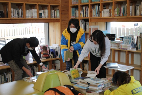 | 図書の整理 一度棚から図書を取り出し、 ジャンルごとにまとめていただきました。 | ![]() |
