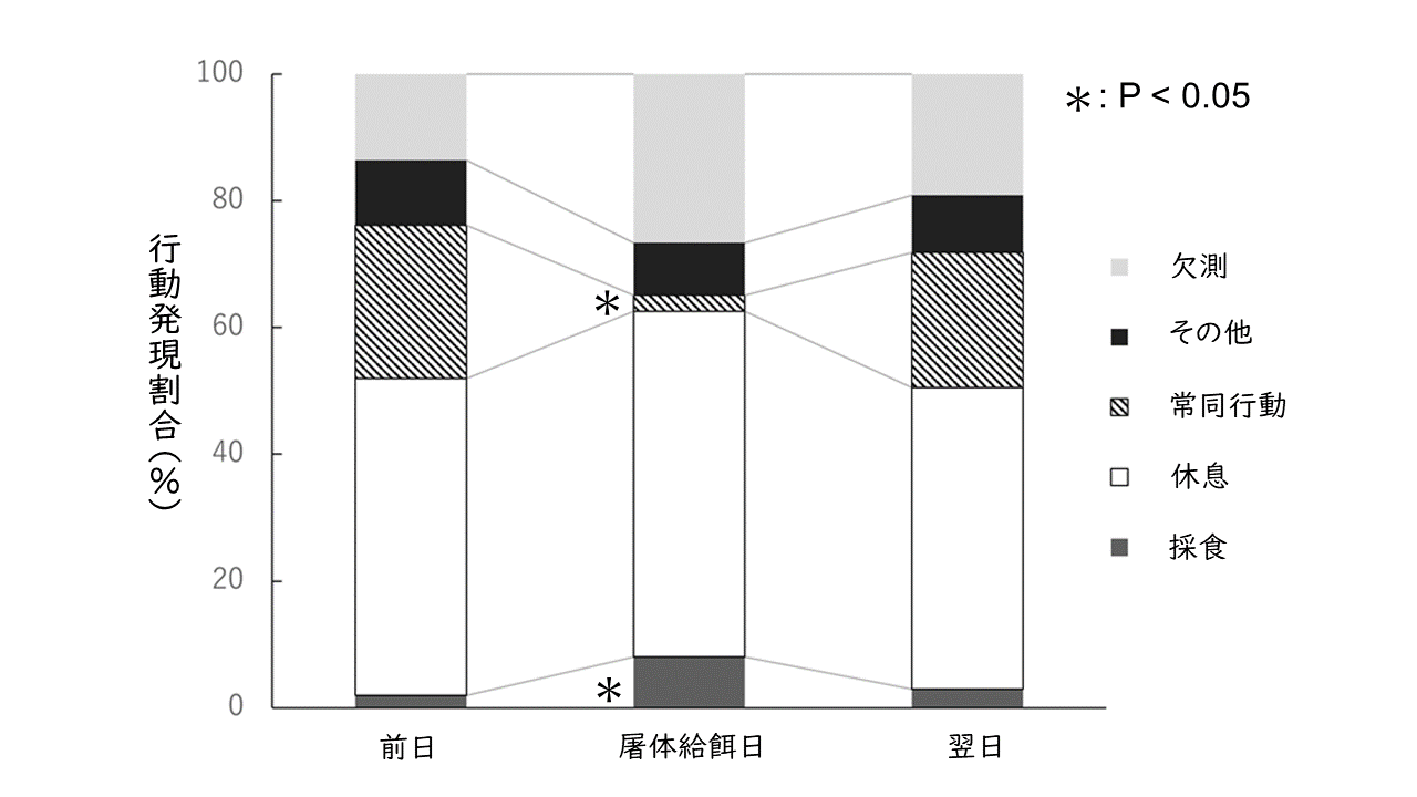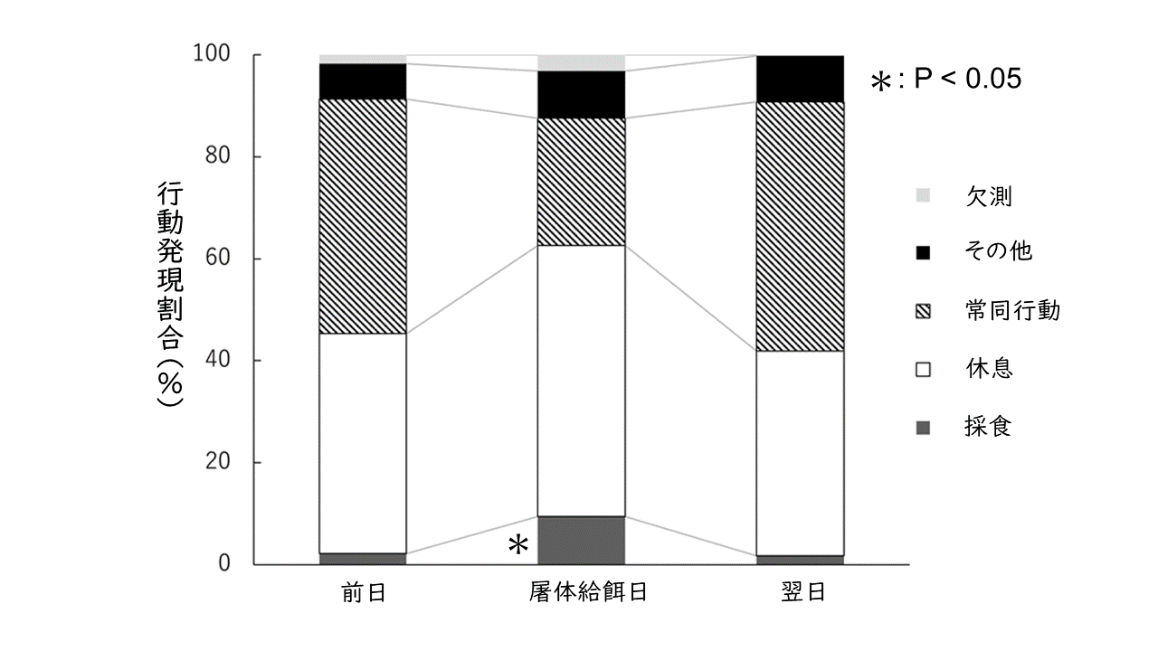 ①屠体を与える前日、当日、翌日で行動は変化しているのか。