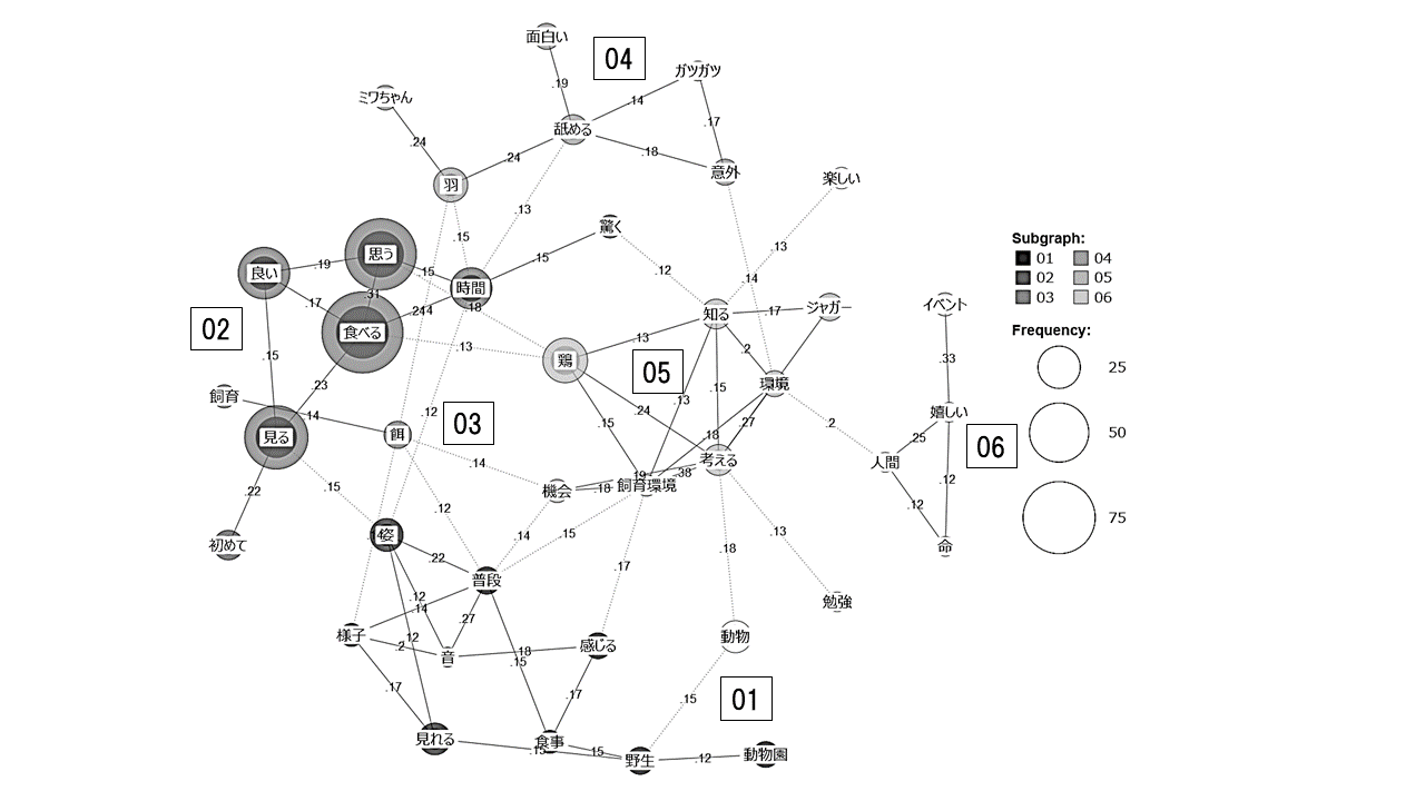 分析ソフトが自動的に、同時に同じ文章に出現した割合の高い単語をグループ化しており、