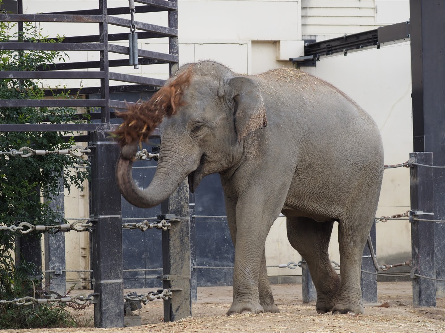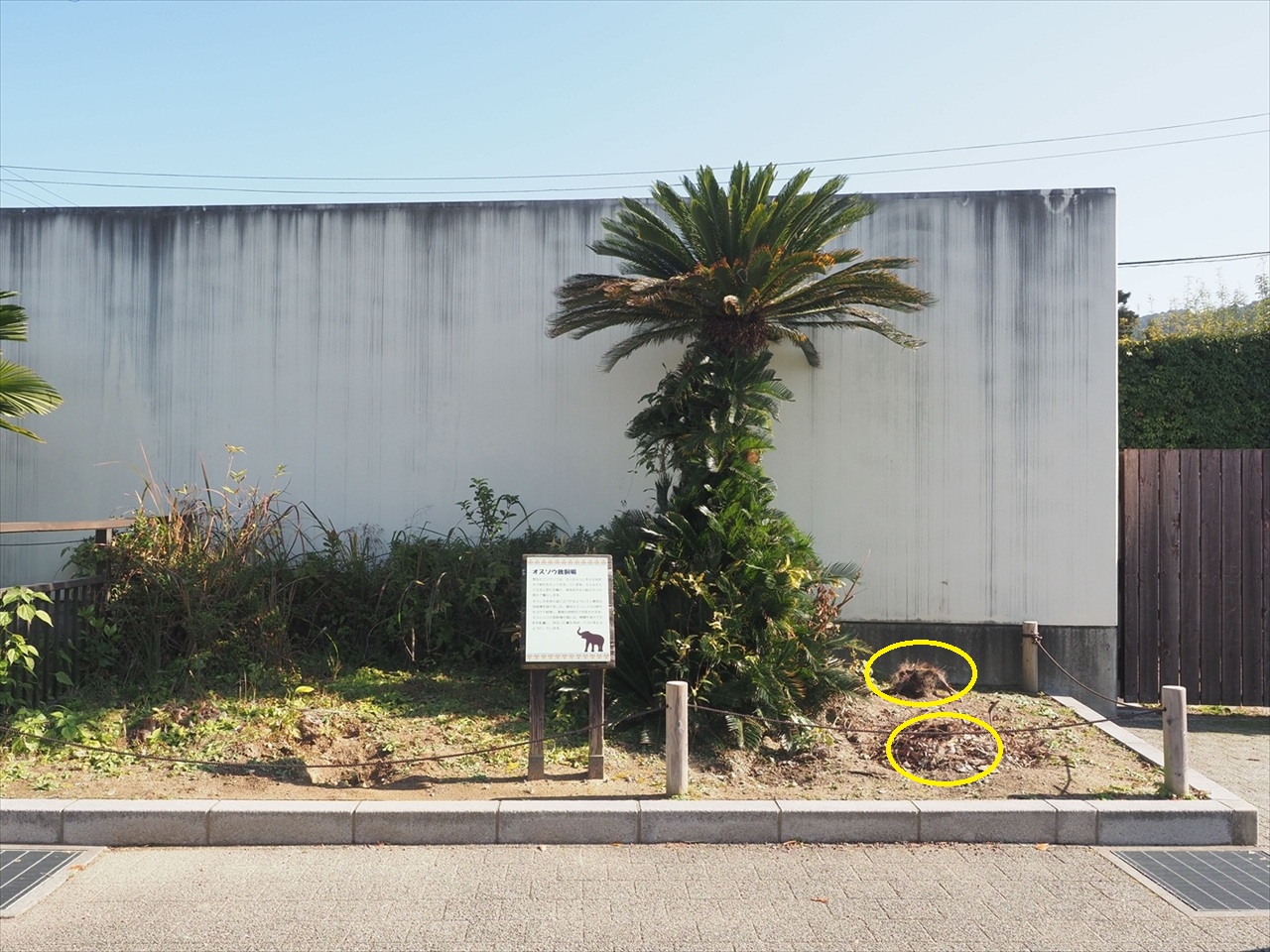 ゾウがシュロで遊んでいるところを紹介(X、インスタグラム、FB)しましたが、それは黄色の丸印のところにあったものです。サルワールド再整備事業を行うにあたり、工事導線となるため、移植や伐採しての有効活用を進めており、その一環で伐採しました。また、ゾウのウンチの展示も一時休止しております。展示中の様子