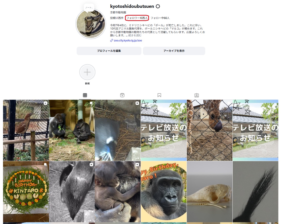 京都市動物園のインスタグラムをフォローしていただいている皆様、ありがとうございます。 本日確認したところ、フォロワーが10万人を達成していました。 年度内には達成できると見込んでおりましたが、ゴリラの赤ちゃん誕生後にフォロワーの伸びが加速したため、年内での達成となりました。節目に到達出来て、とても嬉しいです。 今後もゴリラをはじめ、来年から展示予定のサーバルなど、※授乳の様子(ユーチューブ)飼育動物の魅力とともに、動物園内外の自然についてやイベント・事業などの取組を含め、随時ご紹介してまいりますので、フォロー(https://www.instagram.com/kyotoshidoubutsuen/)並びにご来園をお待ちしております。なお、年内の最終開園日は27日(土)となります。ホロホロチョウ舎前の「クリスマスチアー」も見頃です。ちなみに、今年、一番多い閲覧数を記録した投稿が何だか分かりますか?実は『コチラ』でした。ここまでの反響は想定外でした。園長 和田