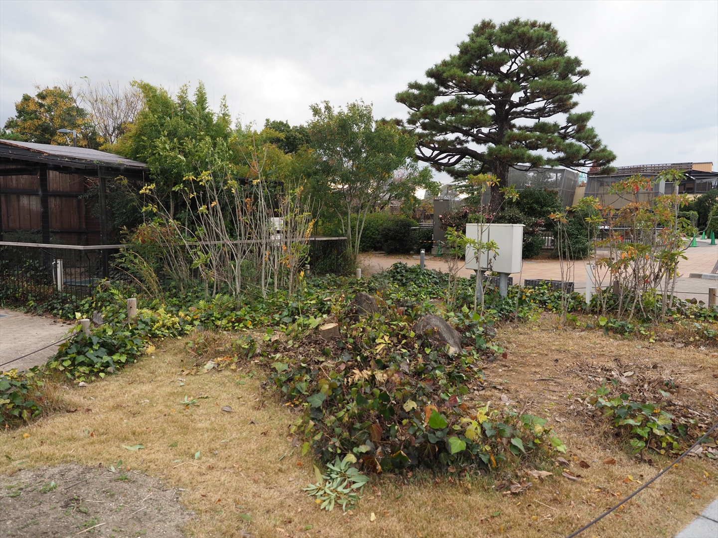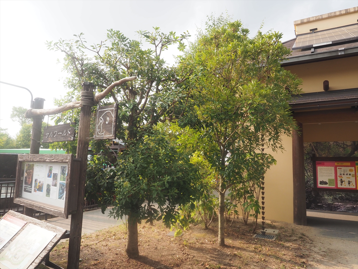 ゴリラのおうち南西側のエリア看板に隣接していたヤマモモ、マテバシイや