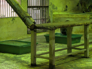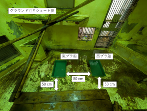 (類人猿舎に設置した観察用機材:プラ船に水もしくはお湯を入れます。)