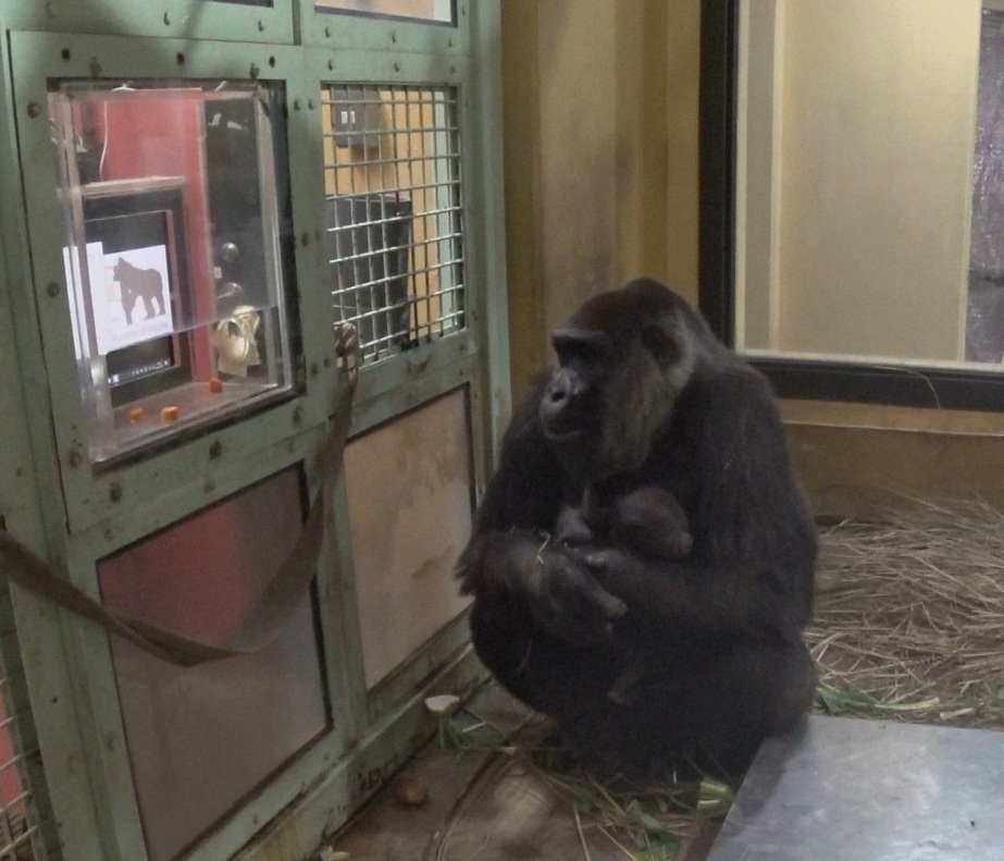 ニシゴリラのゲンキは、出産以来、赤ちゃんを片時も離さずに抱いています。
