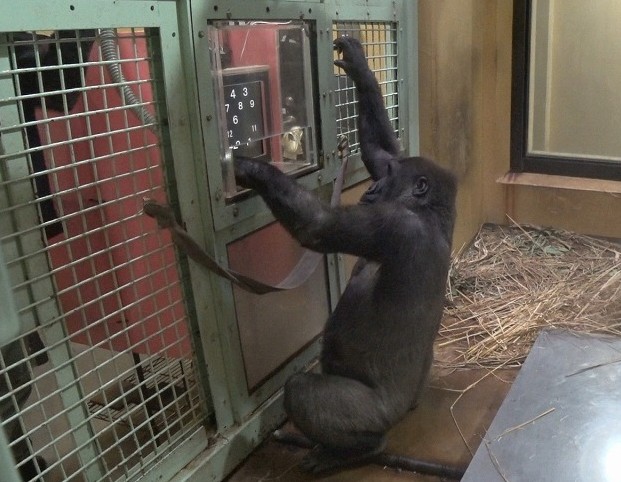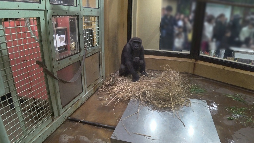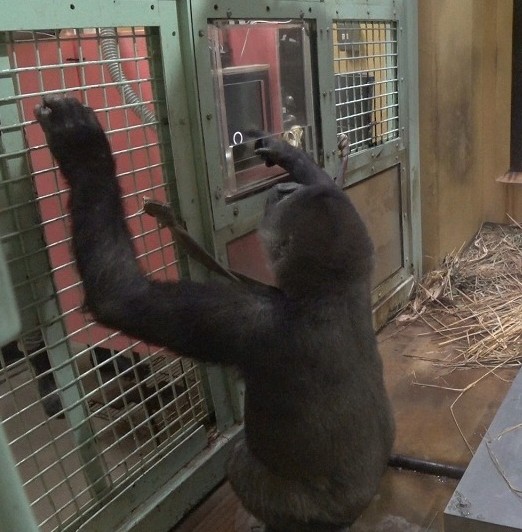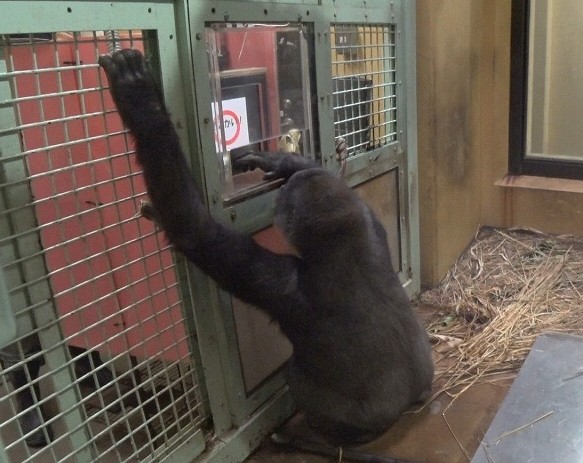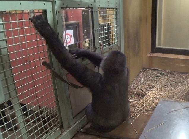 「ゴリラのお勉強」の時間は夕食給餌のときですが、ゲンキが出産してからは、ゲンキの食餌量を管理するため、モモタロウ、キンタロウと別々の部屋で食べています。そのため、キンタロウが勉強に参加できるのは、ゴリラの家族が合流した後、午後4時をまわった、閉園時間に近い時間からになります。その時間からでは、キンタロウに十分時間が取れていませんでした。