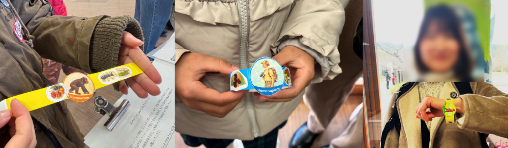 ミッションクリアした方には、人類の進化シールをプレゼント。好きな色のブレスレットに、このシールをつけつつ、野生のチンパンジーの食べ物シールでデコレーションをしていきます。飾り付けしたリストバンドで、イベント感が高まります(写真4)。