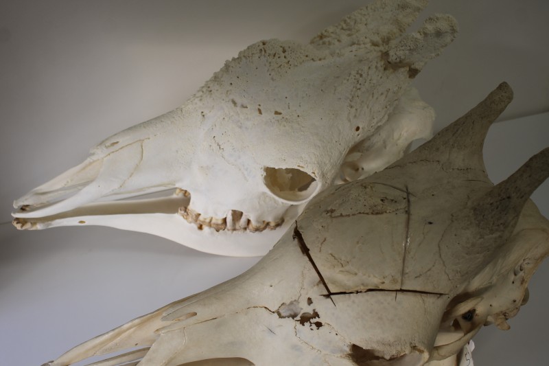 以前ご紹介したメスのキリンの頭骨と比べると、頭頂部から後頭部の二本の主角にかけて、表面がごつごつとしている様子が見て取れるかと思います。