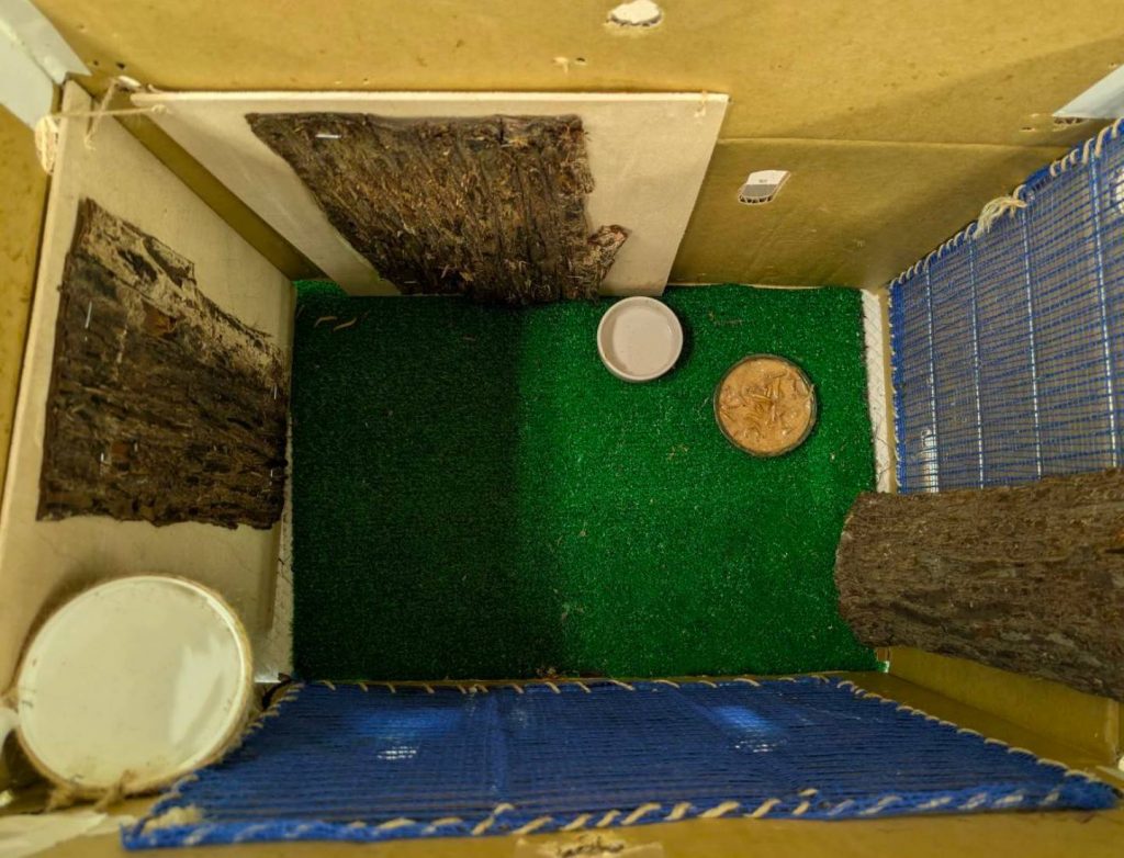 搬入して数日は横たわった状態でいることが多かったのですが、アオゲラは徐々に足の力を取り戻し、「THEキツツキ!」といった体勢をとれるまでになりました。壁面に設置した樹皮につかまり姿勢を維持できるまでに!