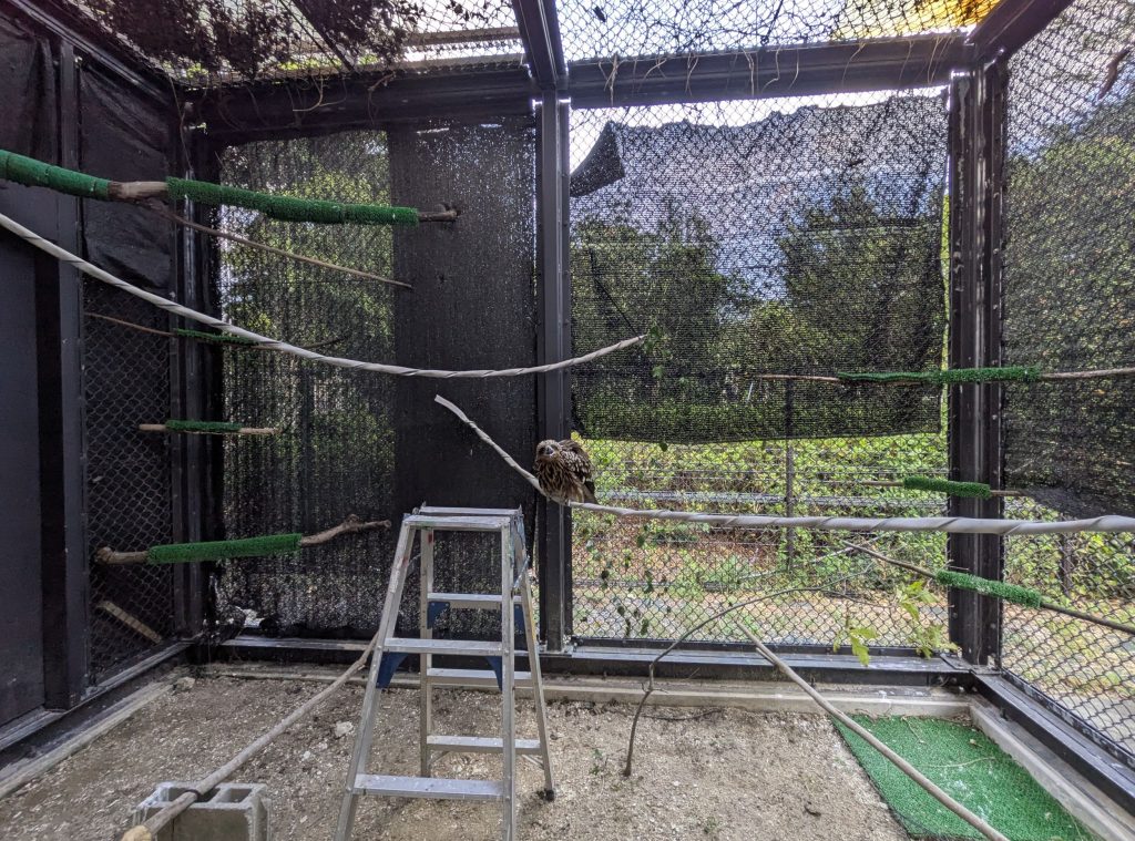 屋外ケージで消防ホースから別の消防ホース、脚立から消防ホースに飛び移ったり、敢えて高い位置に設置した餌を採餌したりと運動量を増やし、トビは確実に筋力をつけていきました。