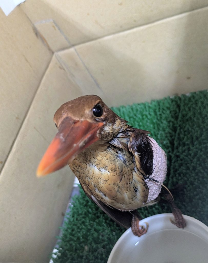 救護センターでは処置等、鳥にとって「嫌なこと」をする事が多いです。このアカショウビンも例外ではありません。ですので日々の管理をするときも、処置をするときも、ストレスが最小限に留められるよう努めました。