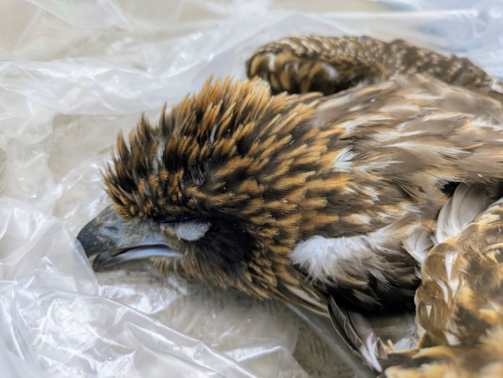 「車で轢いてしまいました」と当事者さんが搬送してくださいました。安全運転をしていても、車は急に止まれない、鳥も急に止まれない…で車両のボンネットに衝突したとの稟告でした。