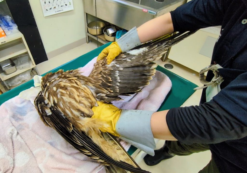 手や足、翼の形や構造は異なれど、骨や関節、筋肉の作りは似たようなものです。それぞれに役割がありそれぞれの可動域がある。鳥の体の解剖生理を熟知したうえで、理学療法を行っているというわけです。今回のトビも人間の理学療法を応用した他動的伸展運動(曲げ伸ばし)、温罨法(ホットパック)を行いました。