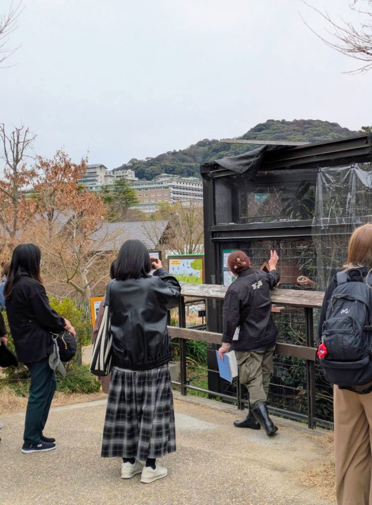 救護センター掲示板前にて野生動物との関わり方について説明させていただき、その後救護センターから動物園内へ移管された個体の紹介を行いました。一人一人皆様のお顔をみながら、アットホームなガイドとなりました。救護実習生さんが餌を与え、それを採餌する様子等も観察していただきました。皆様興味深く観察してくださり良い機会となりました。アイデアを出してくれた実習生さん流石!でありました。