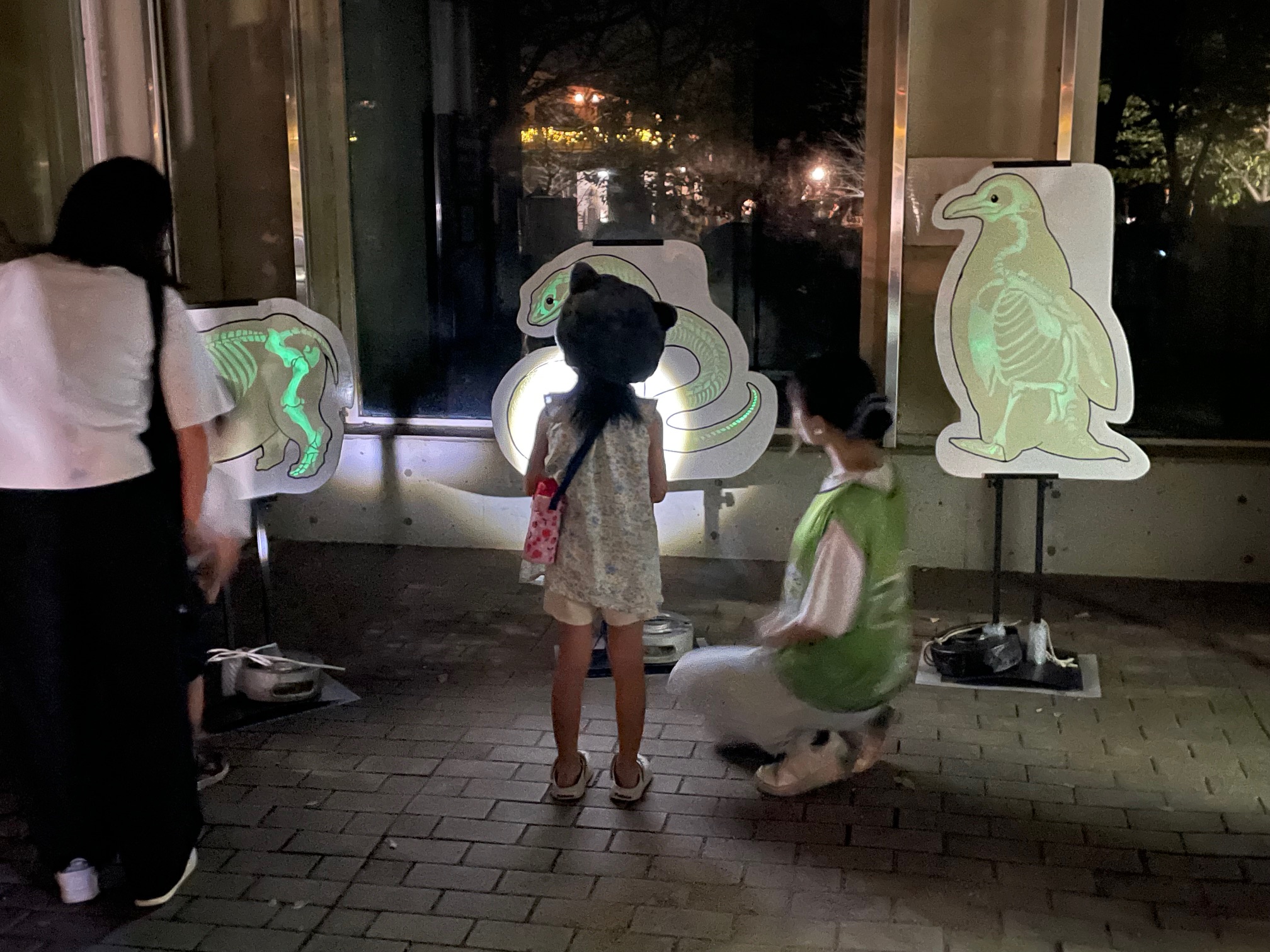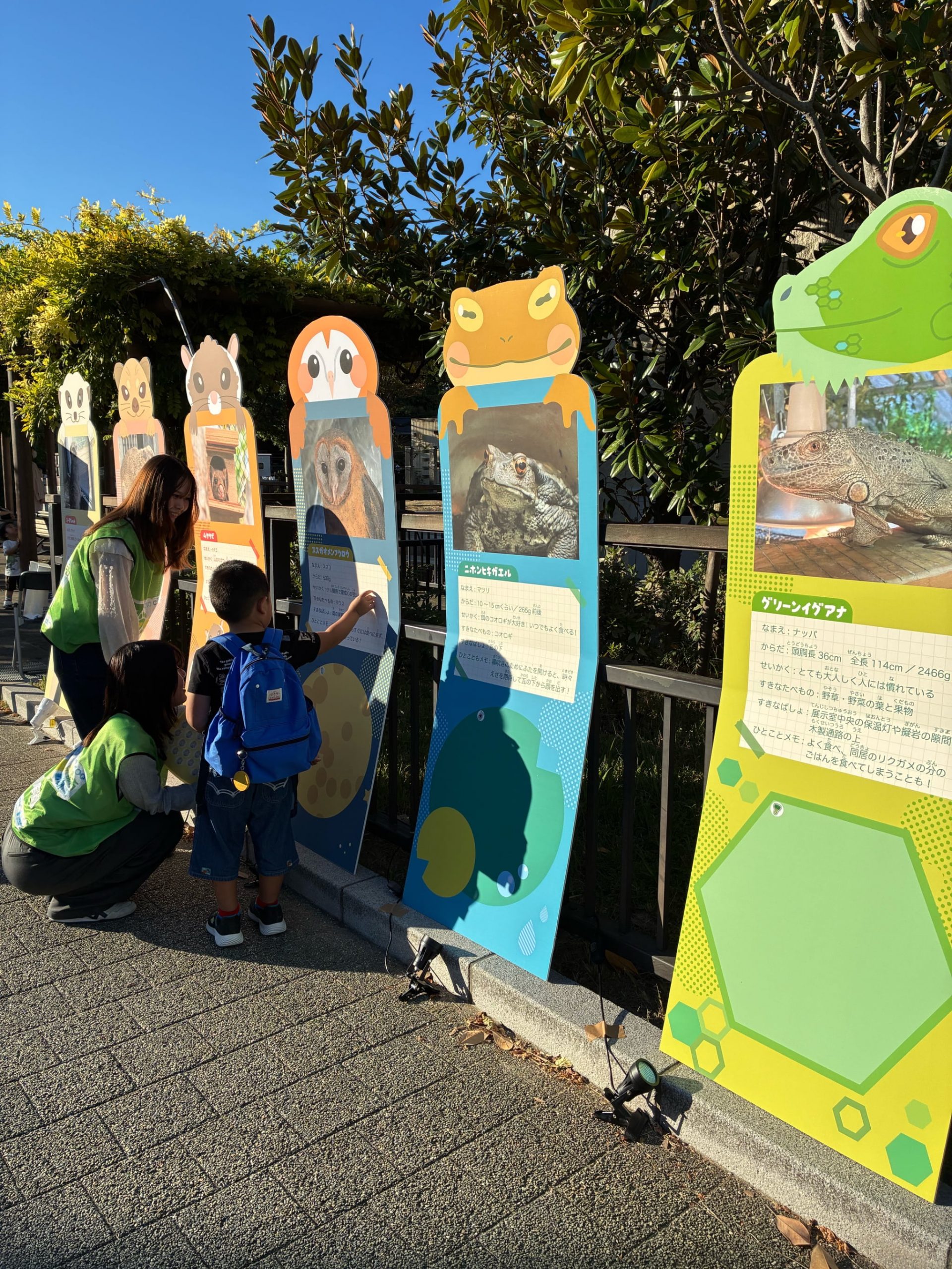 4つのスタンプを重ねて押すと1つの絵になる重ね押しスタンプや、園内を回りながらクイズに答えて動物への知識を深める謎解きゲーム(コミックアート領域との共同イベント)、お昼と夜で姿が変わる光るパネルを企画してくださいました。参加者のみなさまも楽しんで動物のことを学んでいただけたと思います!