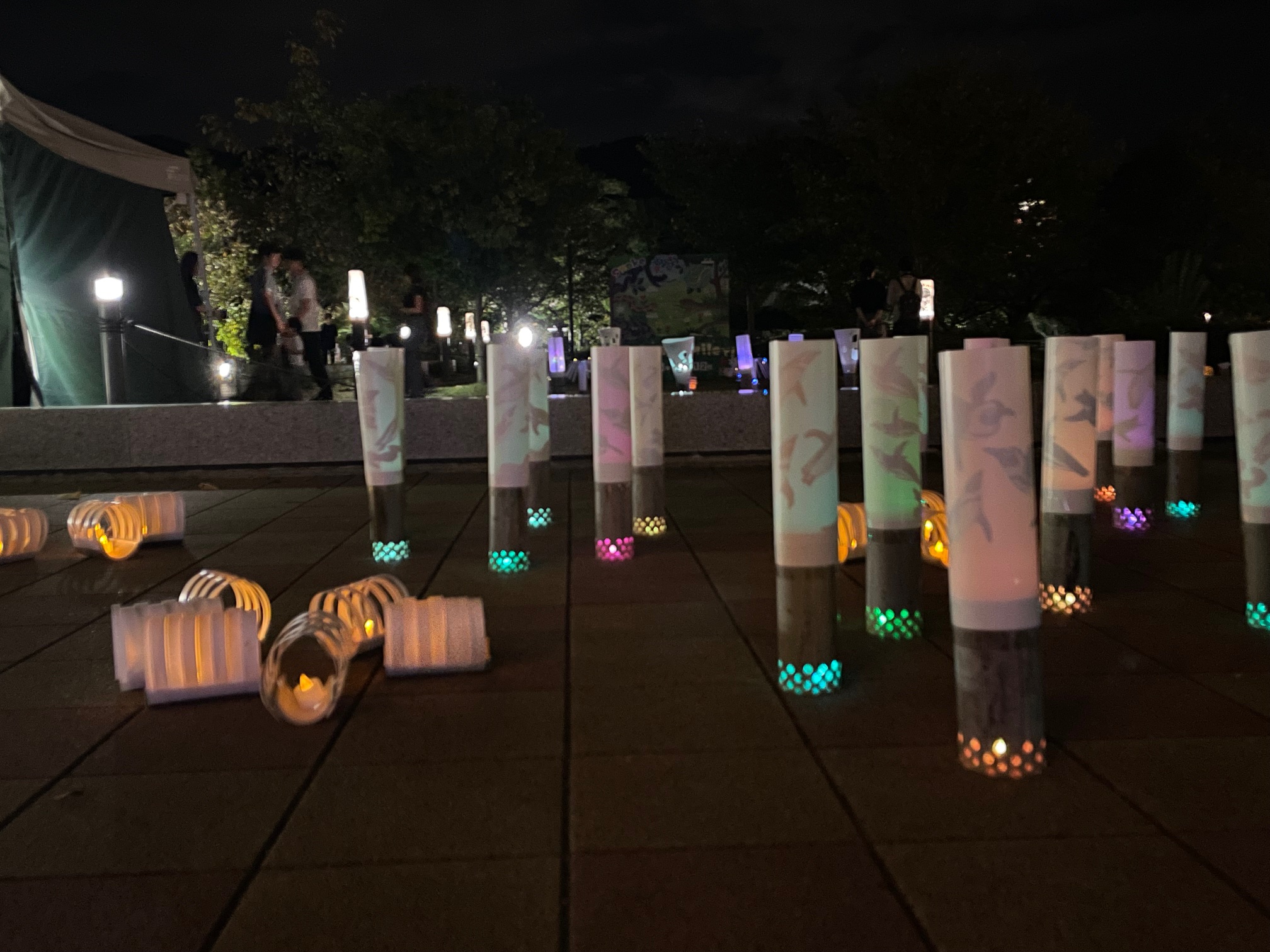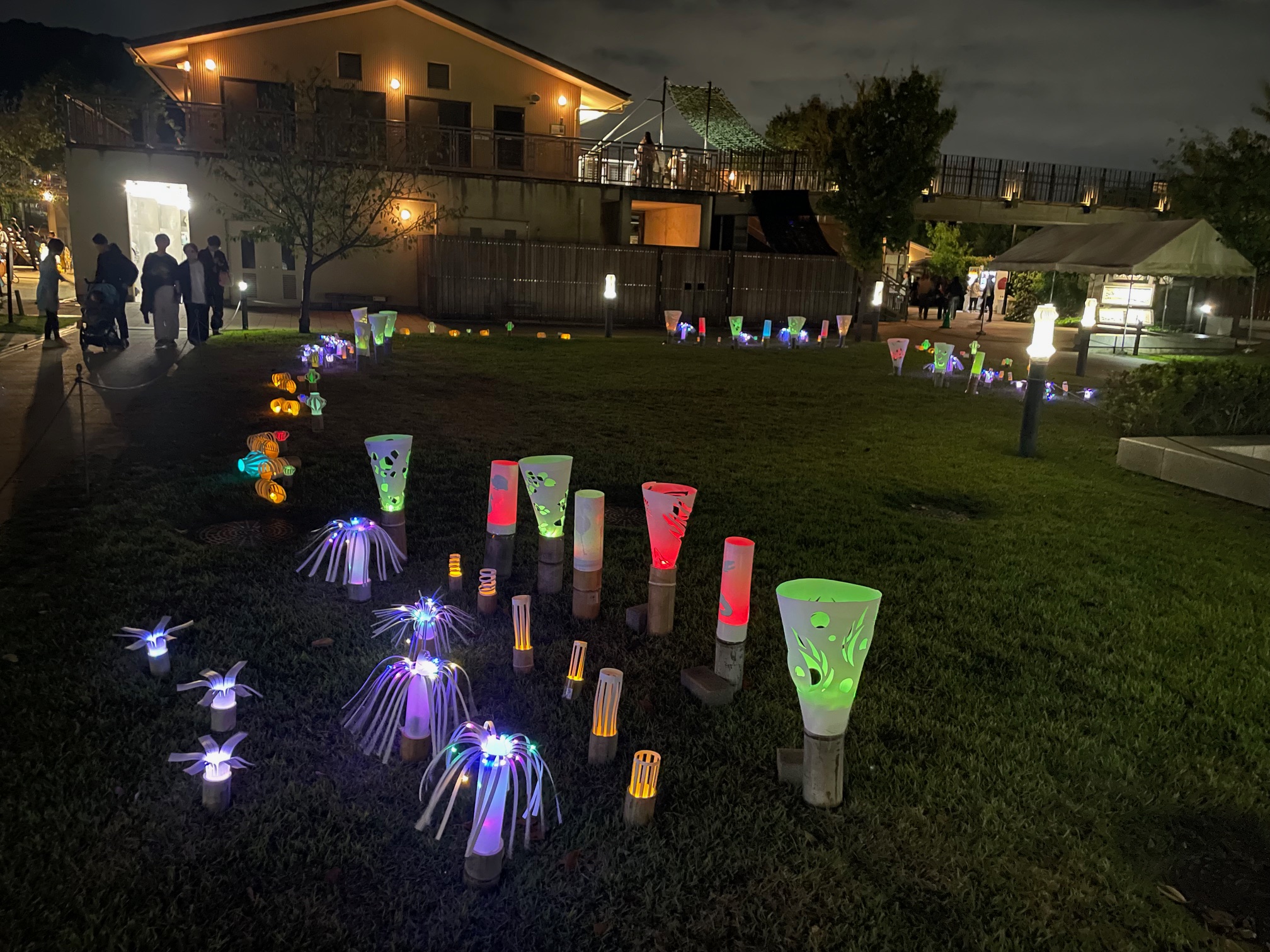 カラフルな灯りのオブジェと動物たちが描かれたランプシェードは、夜間開園ならではの魅力的な作品でした!
